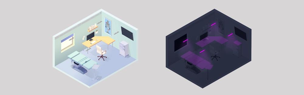 Irradiation with UVC LED systems is an effective approach to maintaining germ-free environments in heavily frequented rooms, complementing conventional sterilization methods. In a simulated scenario for surface sterilization in a doctor’s office, the dimensions were set at 12 by 15 ft, with a height of 8.2 ft. Four linear high-performance "Violet" modules emitting at 280 nm were used, positioned above critical surfaces like an instrument table, treatment couch, desk, and cabinet.